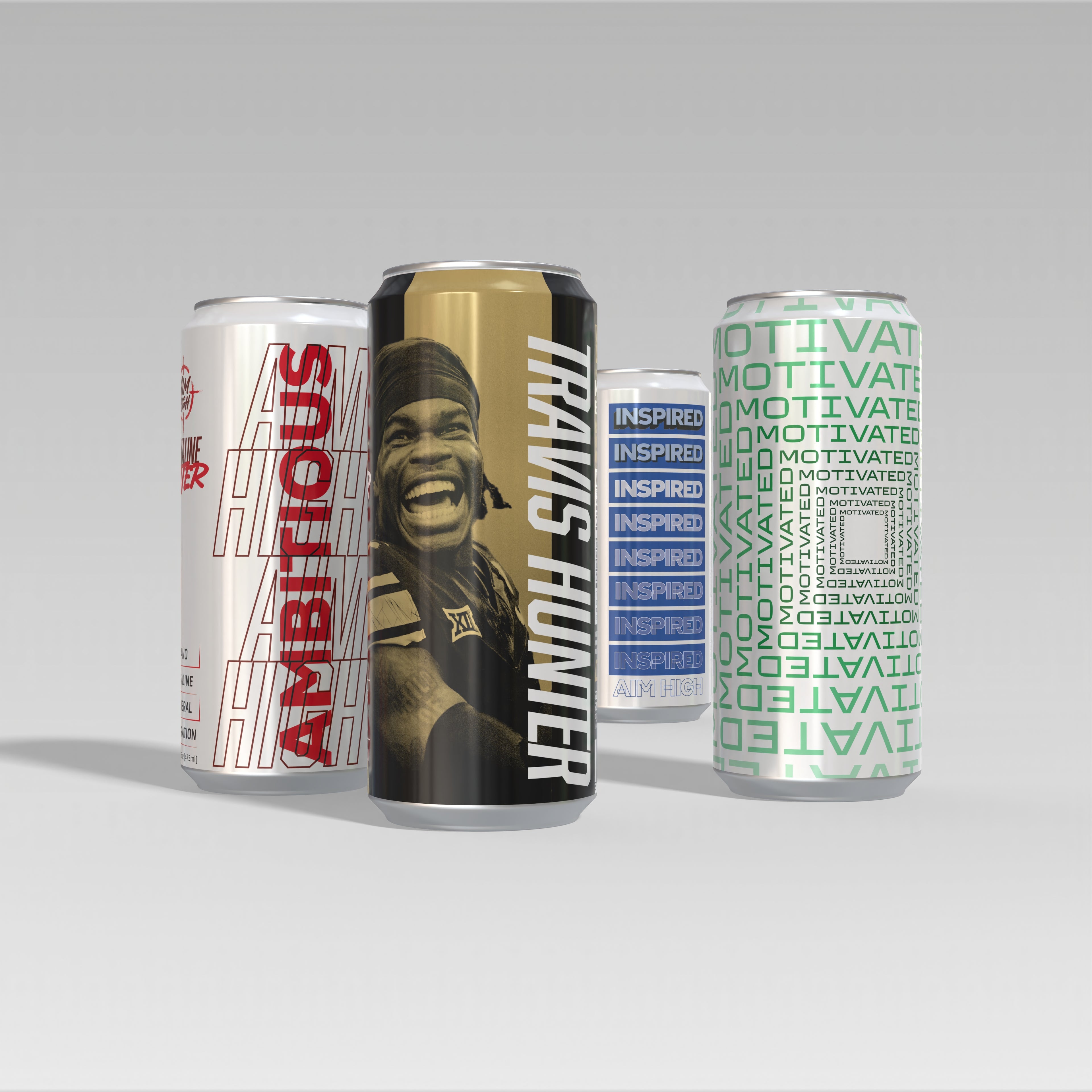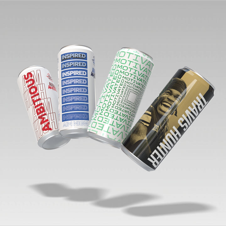 This limited edition Travis Hunter Signature Can mineral hydration water is pre-orderable and will ship in 4 Can Packs. One Travis Hunter Signature Can is included alongside three Aim High Ambitious, Inspired and Motivated cans.